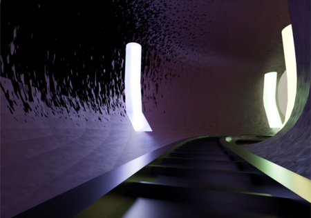 Промт: «3D render created in Blender, showing a dark room with rough stone walls and ceiling that merge into one continuous hemispherical shape, resembling a mine shaft. From the entrance to the exit runs a pair of metallic rails, like those for a mine cart, following the gentle curve of the tunnel. Along the curved walls stand tall luminous pillars that follow the wall’s contour — soft glowing white lights that act as the only source of illumination. Their light reflects subtly off the rough stone surfaces, creating a gradient of purples and blues. At the far end of the room, there is an opening leading into a bright white hall where delicate ceiling suspensions with small glass balls hang in clusters. The atmosphere is cinematic and immersive, with volumetric light, realistic reflections, and soft shadows. Blender-style realism, HDR glow, emissive lighting, and rich contrast between darkness and light.»