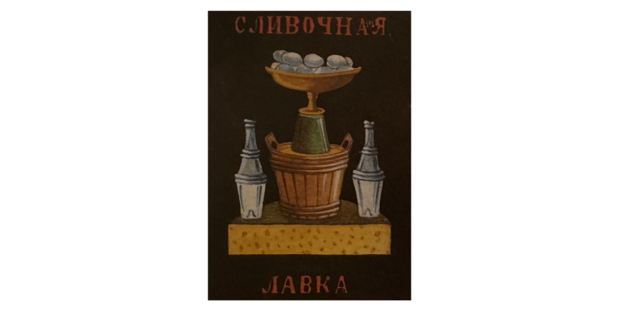 Эскиз для сырной лавки в Санкт-Петербурге. 1880 Тушь на бумаге. 8 ⅝» × 13 ¾» (22 × 35 см). Источник: Повелихина А.В. / Ковтун Е.Ф. Russian Painted Shop Signs and Avant-garde Artists. 1991.