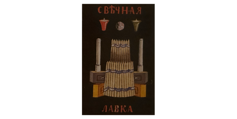 Художник B. C. Степанов. Рекламные щиты лавки Ф. Кузьмина в Апраксином дворе в Петербурге. Начало XX века.